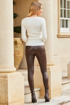 Burgundy Rose Gold Button & Zip Detail Leather Look Leggings