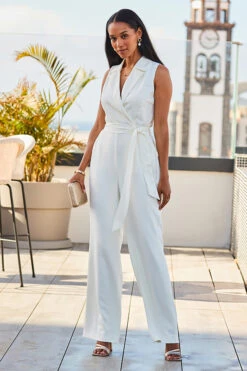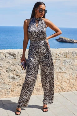 Natural Animal Print Satin High Neck Keyhole Detail Jumpsuit