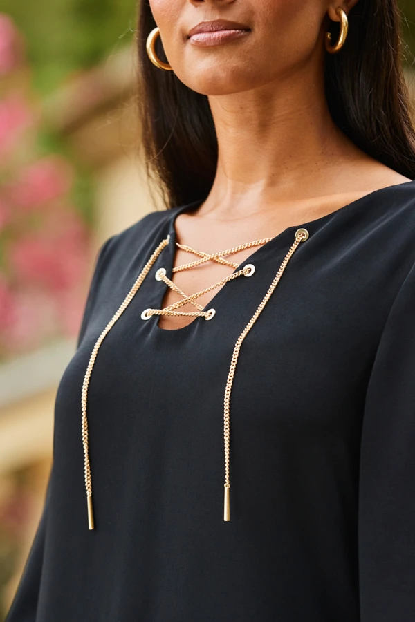 - Outfit-elevating gold chain lace up neckline