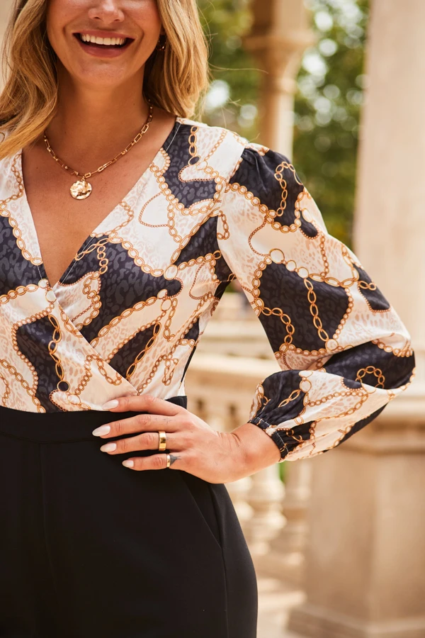 - Stunning faux wrap top crafted from slinky satin