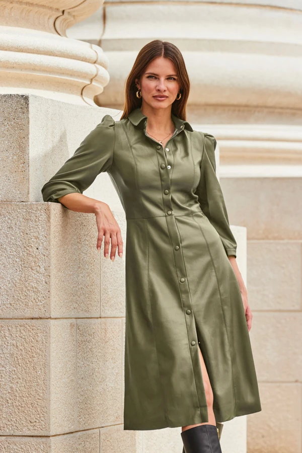 Khaki Green Faux Leather Popper Front Shirt Dress